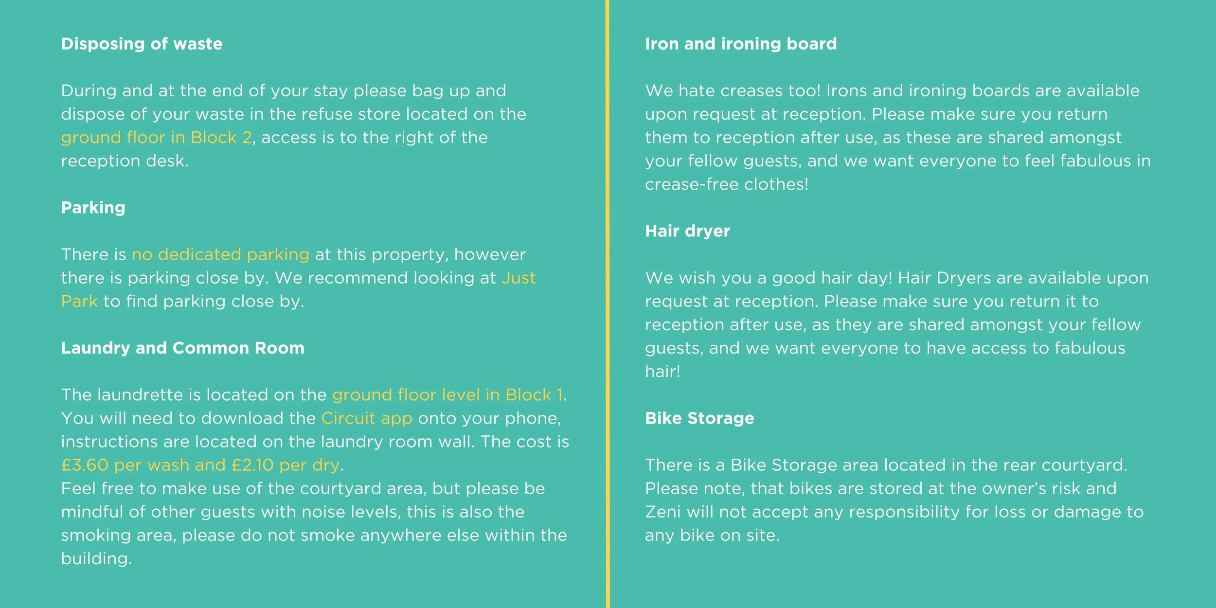Should you have any questions during your stay, your Zeni site manager will be at reception (or the Zeni check-in area) from 3 pm - 8pm every day. If your query is urgent please email us at info@stay-zeni.com or call +442085448099.